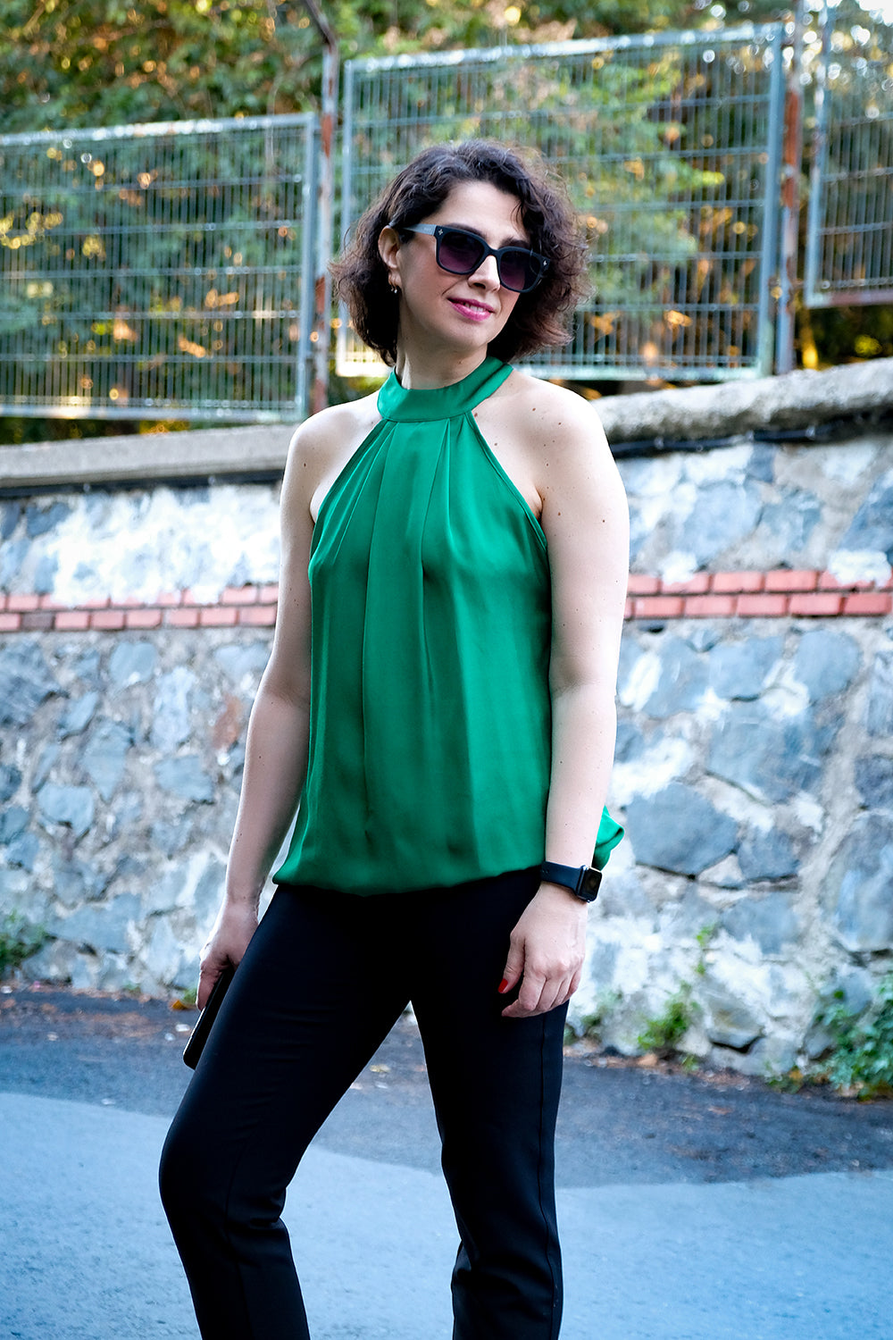 *Yeşil, halter yakalı, kolsuz, pile detaylı, düğme kapamalı